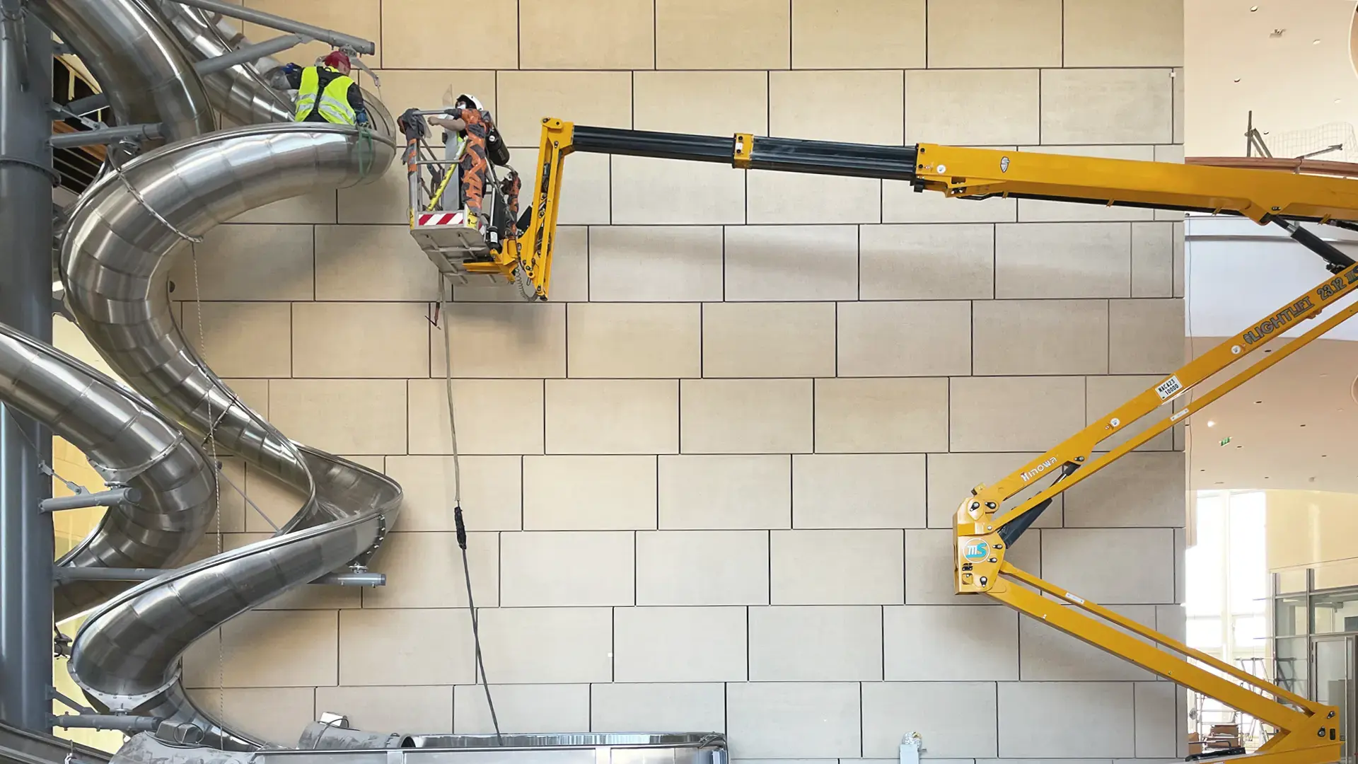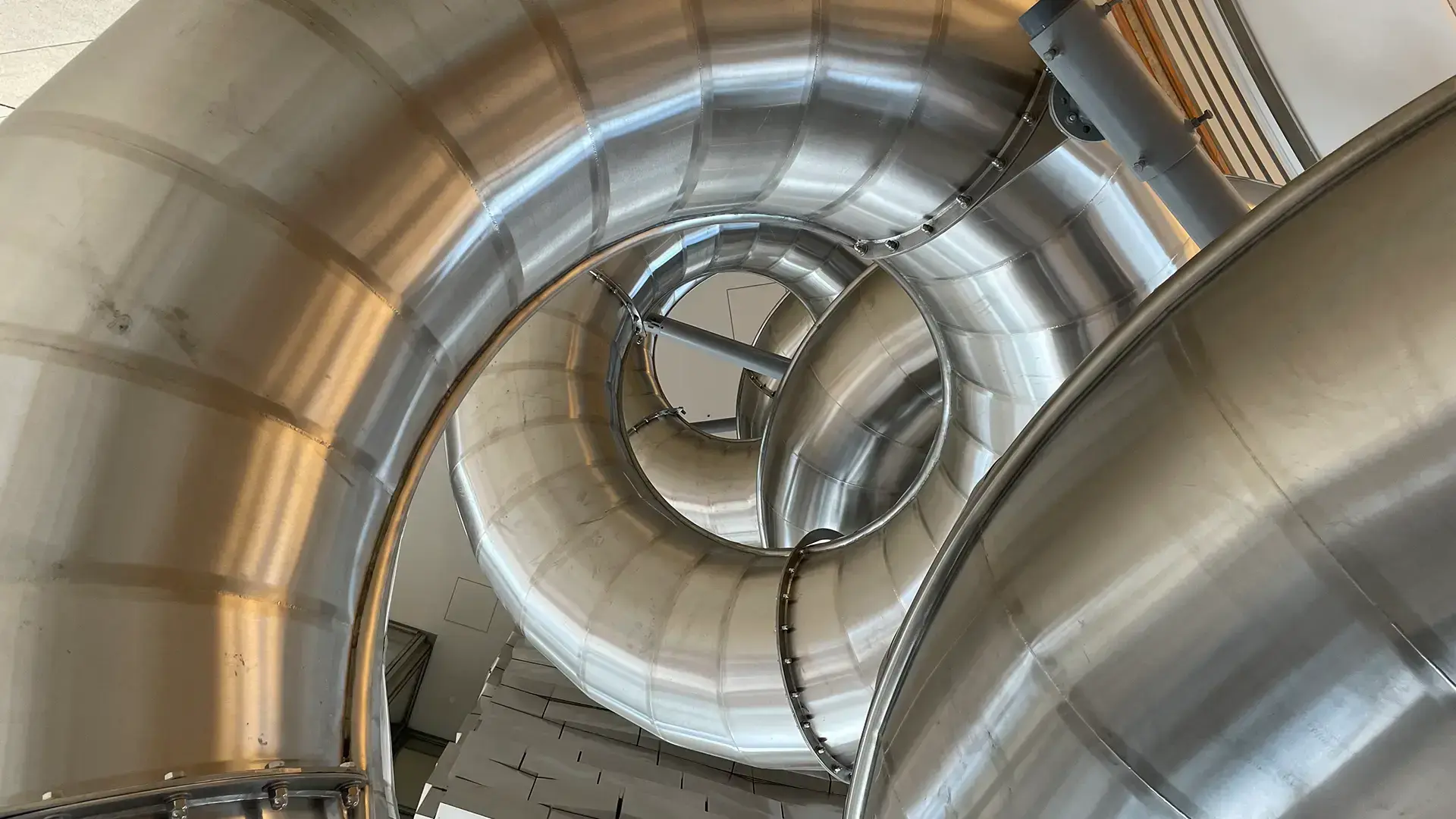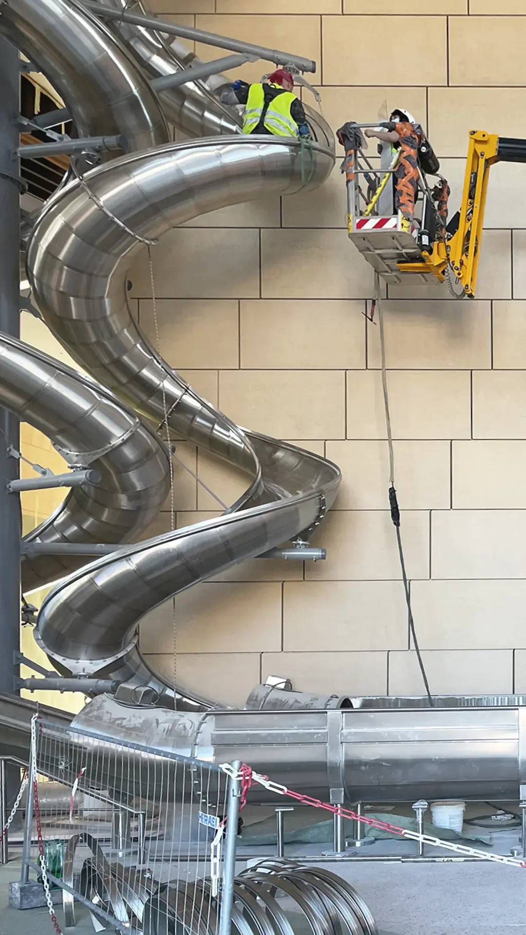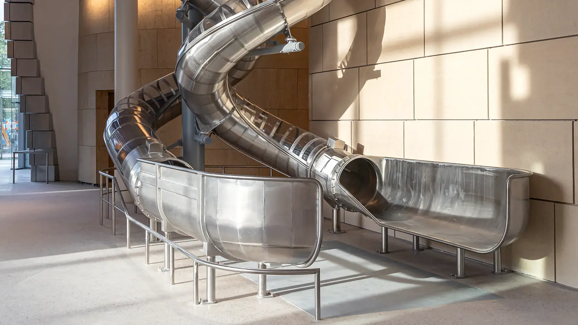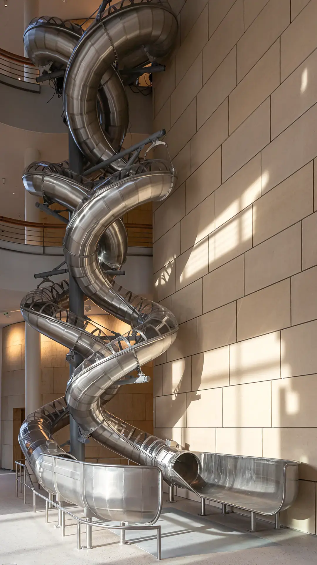 This is a sculpture demanding to be treated as an architectural element. Loads and forces had to be integrated into the building structure, placement had to be determined by architectural spatial decisions, and its functionality contributed a third alternative to the conventional stairs or lift options. It outsmarts architecture in its ability to entertain young and old, whether fearless users or delighted observers.