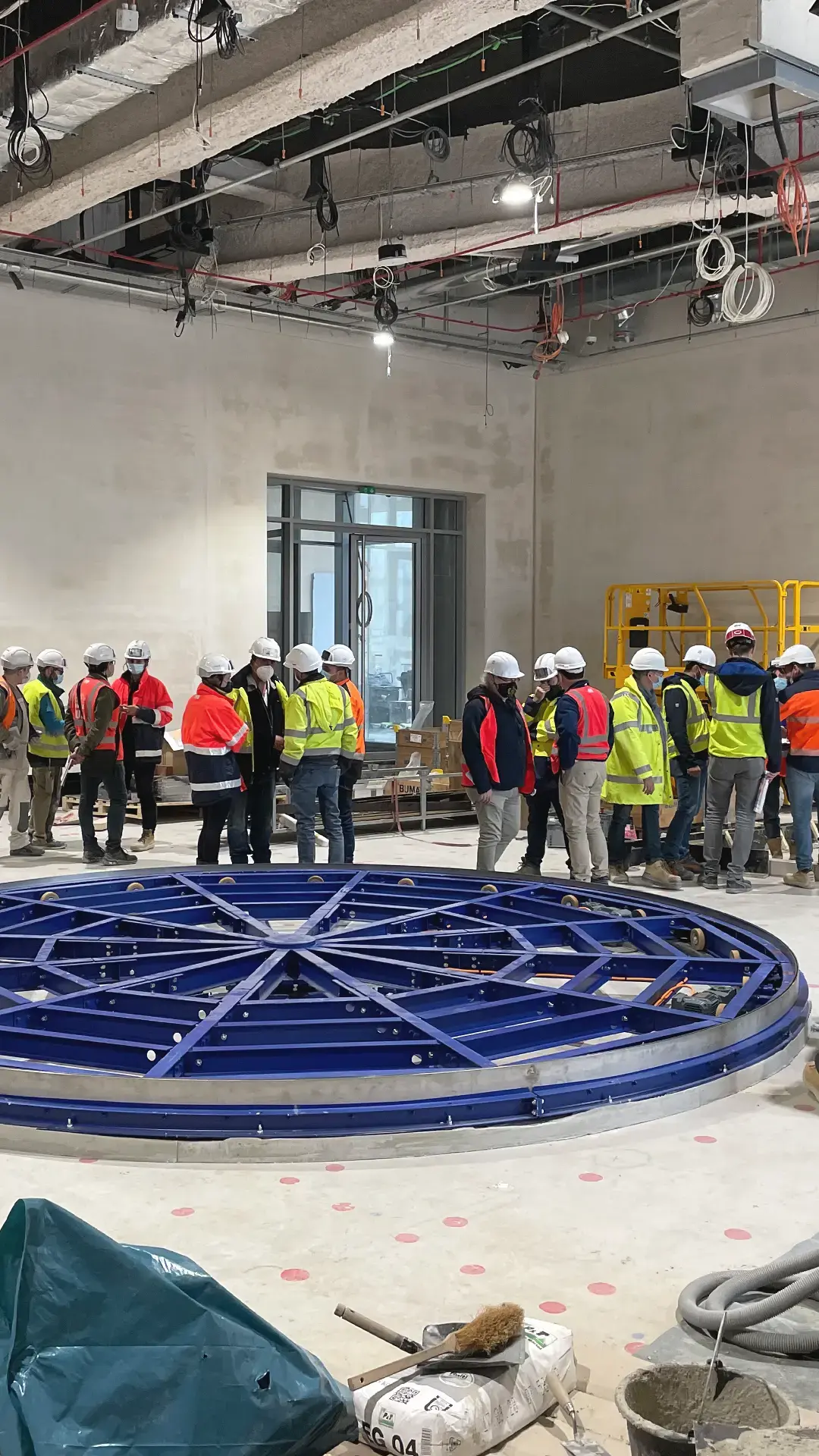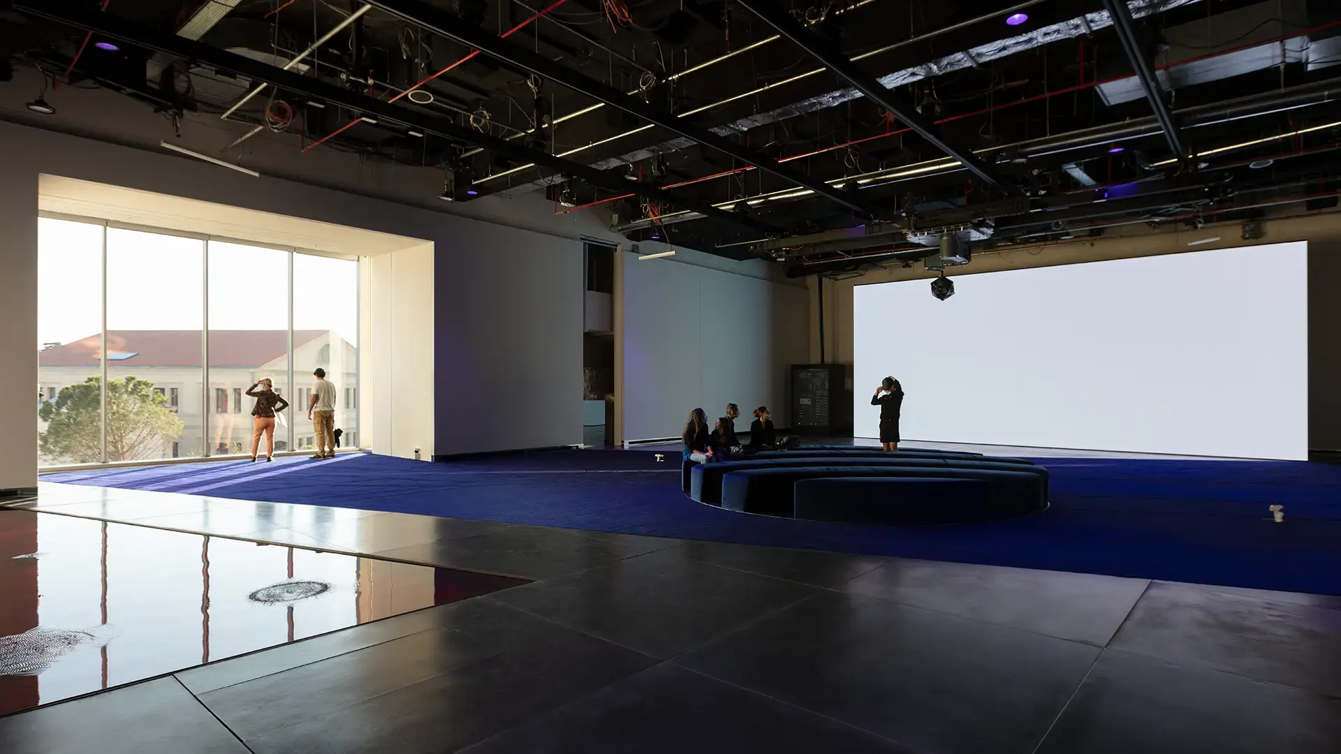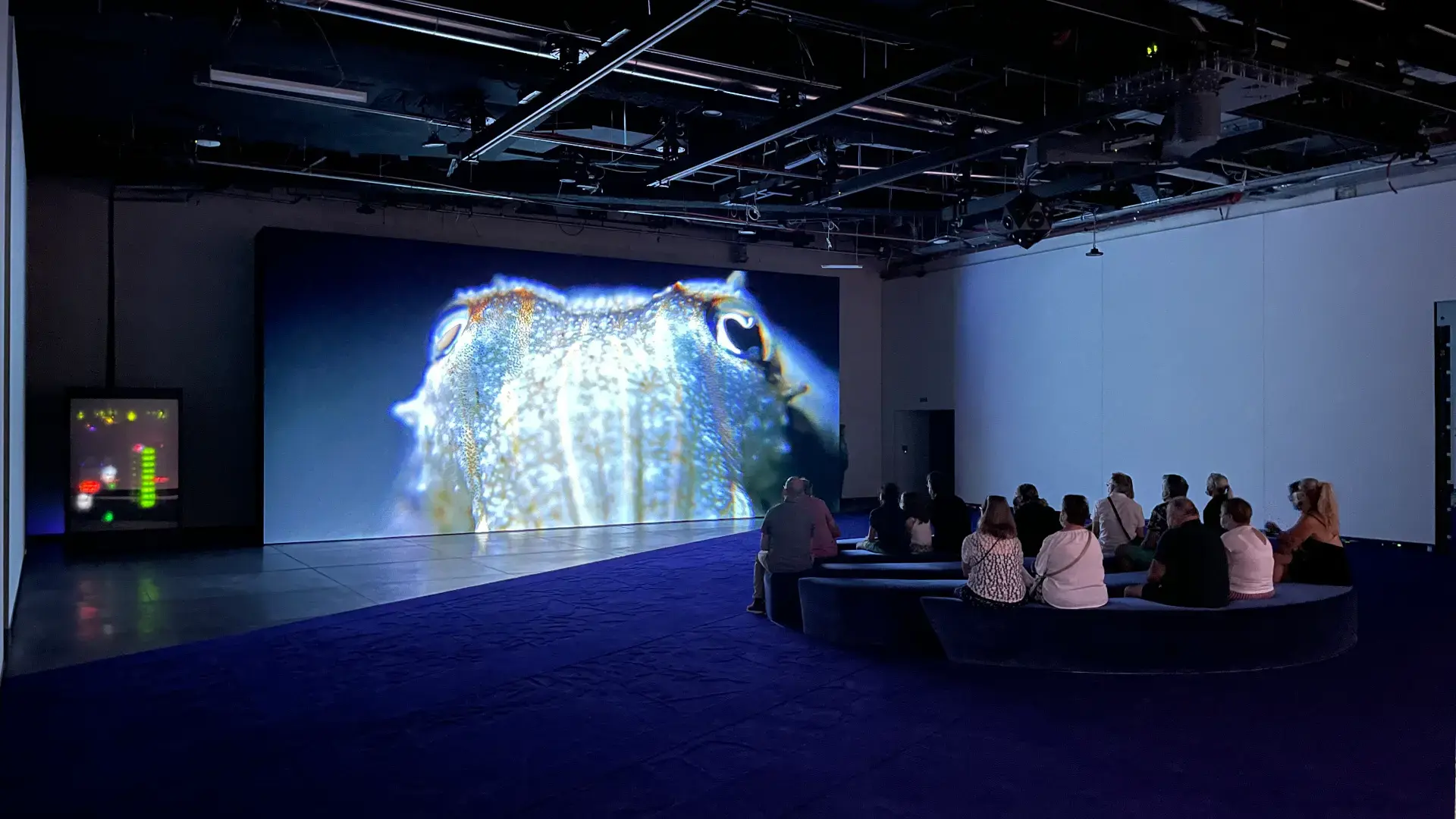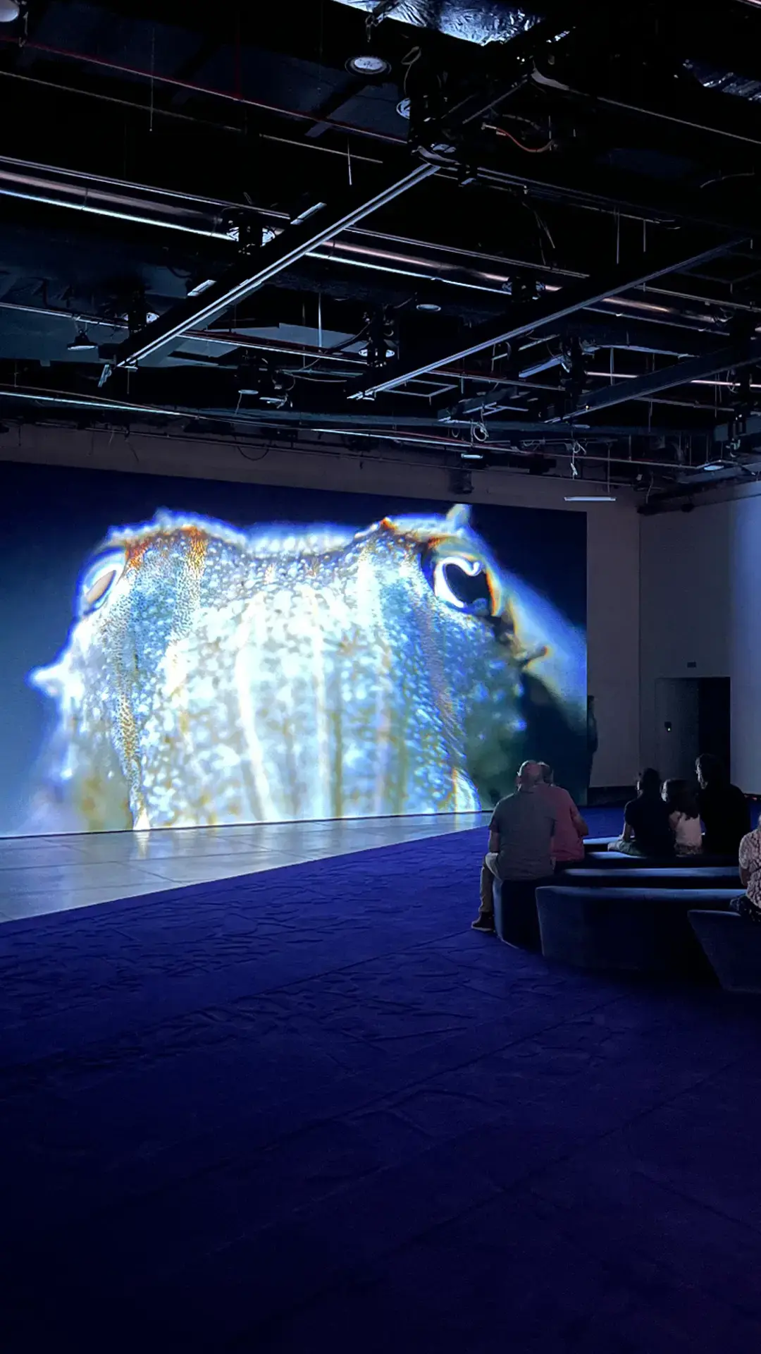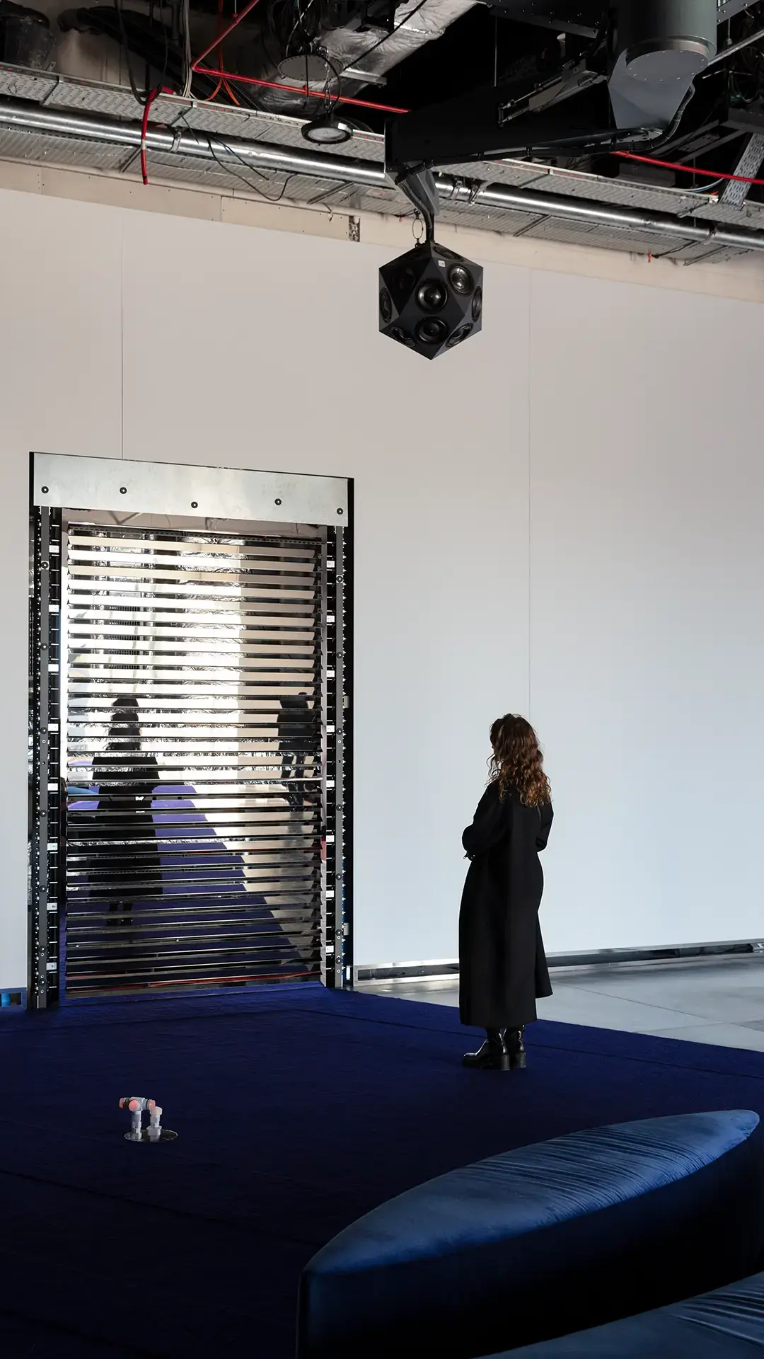 While the focus of this installation seems to be his film-of-films, there is more going on here. The artist’s passion for automatons meant investing the space with interconnected acts of machinery; the water basin holding the sonic lilies, the turntable rotating the bleacher seating, the steel structure suspending the LED screen, the air conditioning unit blowing from behind the mirror-polished shutters, the ceiling tracks moving the faceted speaker, the oversized textile wall panels absorbing sound. All of these were coordinated so the entire room would function as a complex machine in unison with the film.